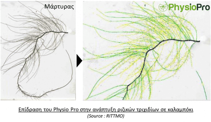 Επιπλέον, τα ενεργά μόρια της τεχνολογίας Physio Pro ενεργοποιούν συγκεκριμένα μονοπάτια και λειτουργούν ως σήματα, που επιδρούν στην κυτταρική διαίρεση και επιμήκυνση των ριζικών κυττάρων. Αυτό έχει ως αποτέλεσμα την έντονη ανάπτυξη ριζικών τριχιδίων, στα οποία οφείλεται η απορρόφηση του νερού και των θρεπτικών συστατικών.